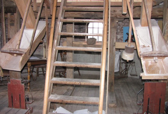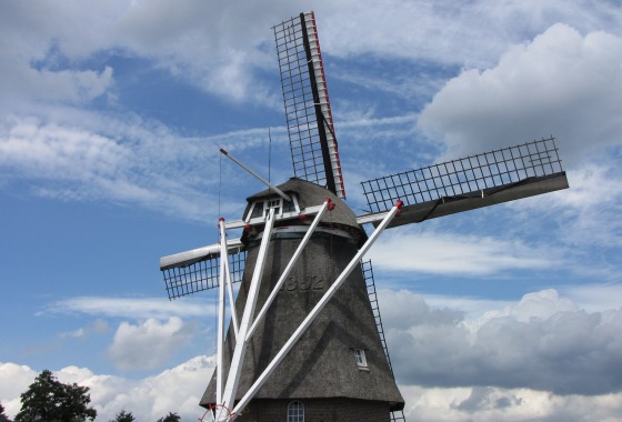 Kom binnen in de molen en beklim de eerste trap naar de 3 meter hoge stelling (het 'balkon' rondom de molen). Bewonder het fraaie uitzicht en verwonder je over de enorme wieken, het kruirad en de 'staart' van de molen.